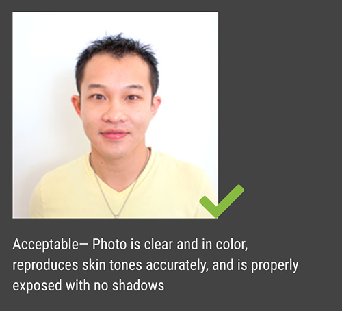 Step 2: Obtain two WHITE background color passport photo 2” x 2” (5 x 5 cm) taken within the past 6 months; no eyeglasses. See more information on photo requirements.