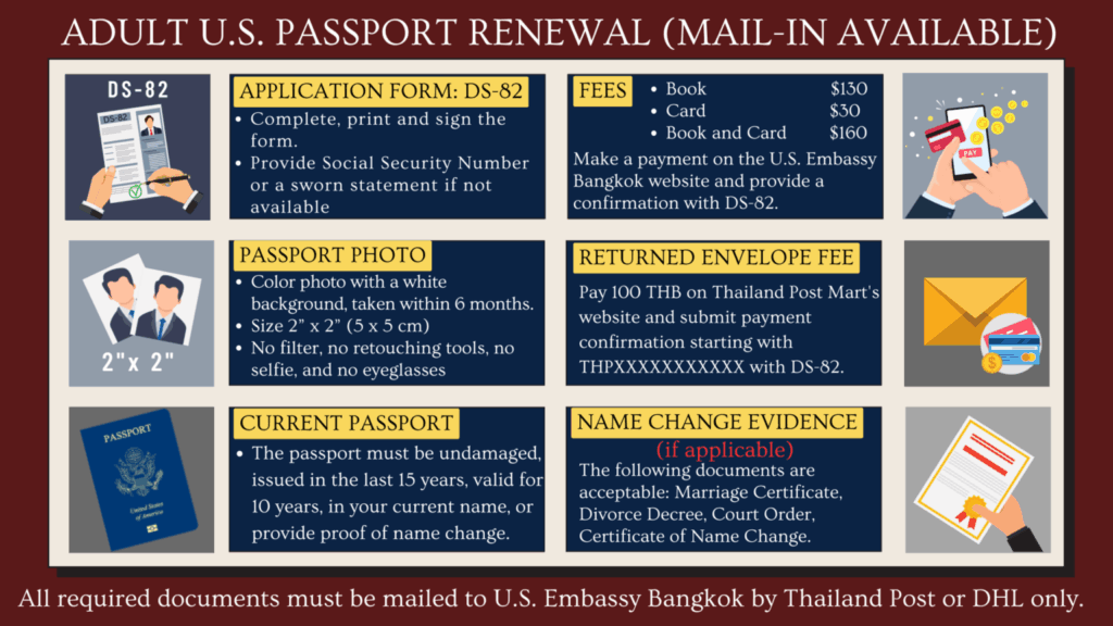 Most adults who are holding 10 years validity passport book and/or card are eligible to renew your passport by mail if you are residing in Thailand. Personal appearance is NOT required. You do not need to travel to the U.S. Embassy/Consulate.