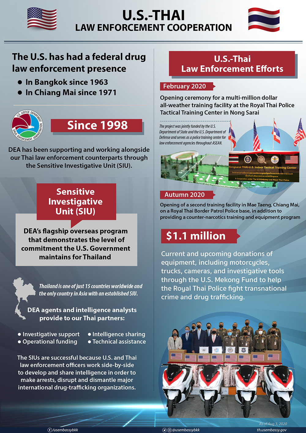 Close international law enforcement partnerships are the proven method to successfully combat transnational crime, and the U.S. government is in it for the long-haul. There is a phrase in the United States – you must put your money where your mouth is – which means you can’t just talk about a problem, you also have to act. And the United States has been acting! The United States has had a federal drug law enforcement presence in Bangkok since 1963 and in Chiang Mai since 1971. Since 1998, the DEA has been supporting and working alongside our Thai law enforcement counterparts through the Sensitive Investigative Unit (SIU) – the DEA’s flagship overseas program that demonstrates the level of commitment the U.S. government maintains for Thailand. Thailand is one of just 15 countries worldwide and the only country in Asia with an established SIU. DEA agents and intelligence analysts are embedded in the unit and act as agent advisors to provide investigative support, operational funding, intelligence sharing, and technical assistance to our Thai partners. The SIUs are successful because U.S. and Thai law enforcement officers work side-by-side to develop and share intelligence in order to make arrests and disrupt and dismantle major international drug-trafficking organizations.