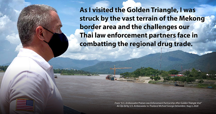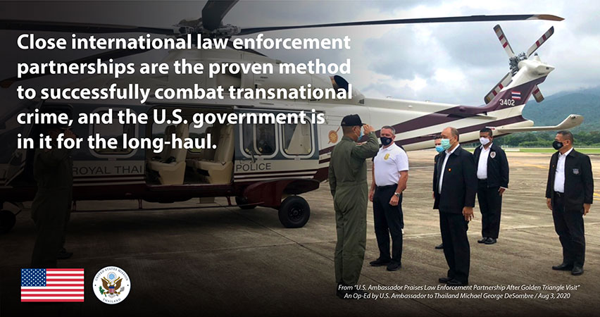 Unfortunately, the beauty of this region is often overshadowed by news and reports of the trafficking of humans, wildlife, and especially drugs. What is less well-known is the tremendous cooperation between U.S. and Thai law enforcement, and the progress we are making to protect the citizens of our two countries. Despite the challenges, together we have countered criminal organizations through joint investigations and enforcement operations. In recent years, Thailand has seized more methamphetamine than any other country in East and Southeast Asia, confiscating 116 tons in 2018 and 2019. Seizures of methamphetamine tablets (yaba) tripled over a five-year period from 113 million in 2014 to 381 million in 2019, according to the UN Office on Drugs and Crime (UNODC). During that same time-period, seizures of crystal meth increased dramatically from 1,017 kg in 2014 to 17,077 in 2019. I am proud of the assistance the United States has provided our Thai allies to help them achieve these milestones. Yet the job is far from done.